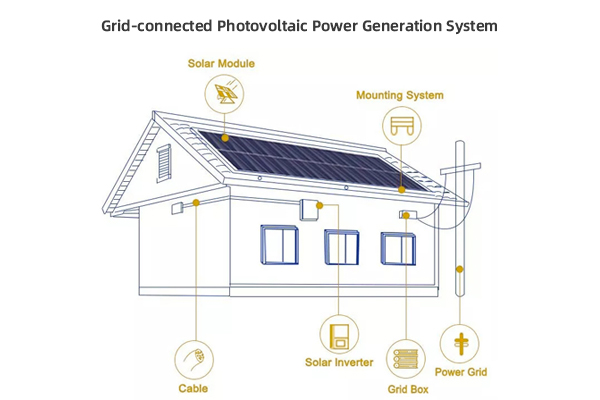 يمكن لنظام توليد الطاقة الكهروضوئية المتصل بالشبكة تحويل خرج طاقة التيار المستمر بواسطة مجموعة الخلايا الشمسية إلى طاقة تيار متردد بنفس السعة والتردد والمرحلة مثل جهد الشبكة، وتحقيق الاتصال بالشبكة، ونقل الكهرباء إلى الشبكة.تكمن مرونة نظام توليد الطاقة هذا في حقيقة أنه عندما تكون أشعة الشمس قوية، يقوم نظام توليد الطاقة الكهروضوئية بتزويد حمل التيار المتردد بالطاقة الكهربائية الزائدة أثناء تغذيته في الشبكة؛وعندما تكون أشعة الشمس غير كافية، أي أن مجموعة الخلايا الشمسية لا يمكنها توفير طاقة كهربائية كافية للحمل، ويمكنها أيضًا الحصول على الطاقة الكهربائية من الشبكة لتزويد الحمل بالطاقة.
